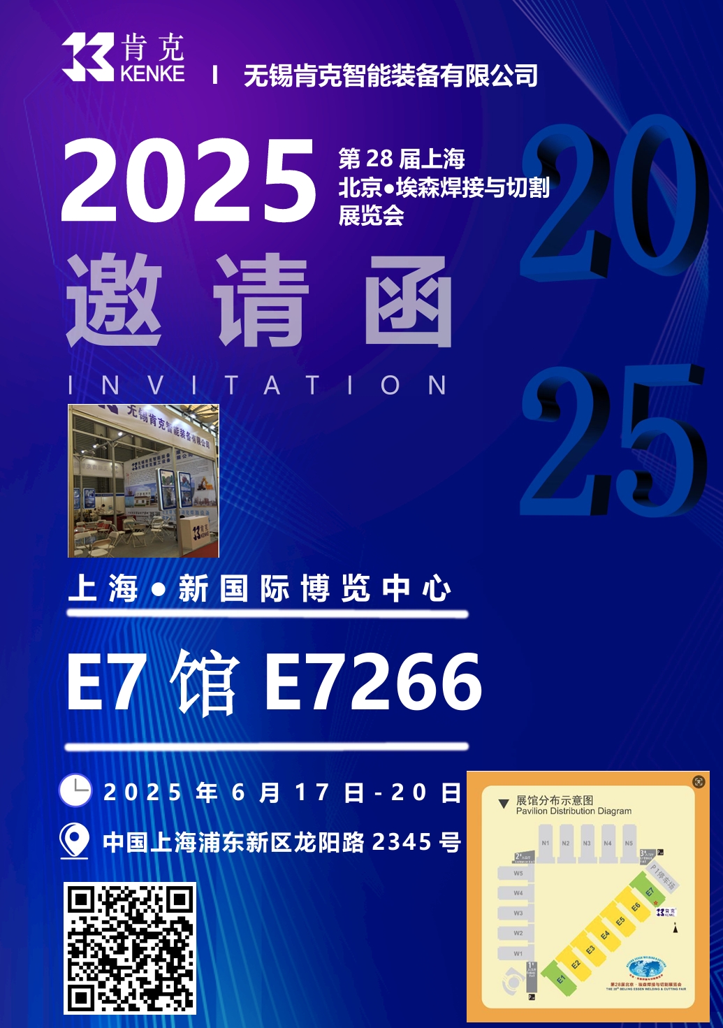 無錫肯克智能裝備將于2025年6月17-20日參加在上海新國際博覽中心舉辦的第28屆北京埃森焊接與切割展覽會(huì),歡迎新老顧客蒞臨我司展位,我司展位位于E7館,展位號(hào)E7266。